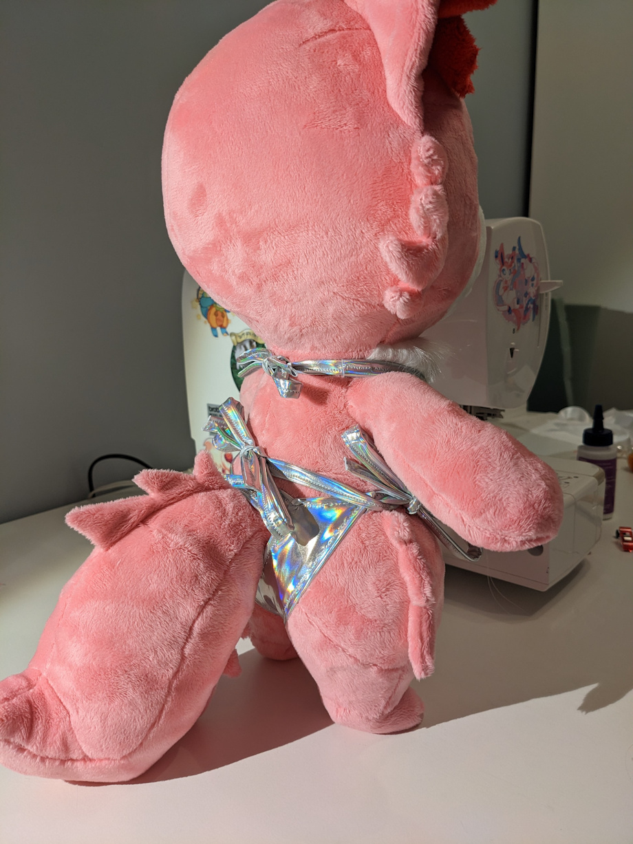 She's got magnets in her hands, under her eyes (I want to try expression things like some fursuits have), and on her ear where her bow is. I also made two outfits so far, based off her main outfit from happiness and her bikini from season 1.