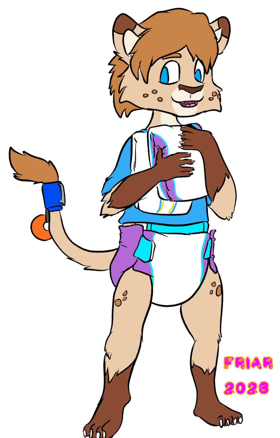 Illustration of Toffee standing before the changing table, diaper pail and swan potty carrying one of his diapers and one for Everett. He's currently in a clean diaper.