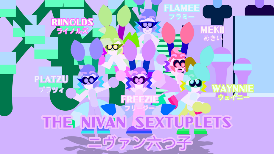 The Nivan Sextuplets The Gang of 6 Nivan(A some sort of Eevee with fish fins and Alien Antennae) Bros and Sis. They're new to "In Arctra" So give them some love. Since In Actras going to be a Slice of life/SuperNatural WebSeries, These guys will have their own segment like Arcue and Trinity have. Characters Freezie the Nivan(Bottom Center) Color Palette(Pink with Purple and Blue) Age: 16 Height: 4.5'5" Gender: Female Species: Nivan(A some sort of Eevee with fish fins and Alien Antennae) Birthday: April 24th Platzu the Nivan(Bottom Left) Color Palette(Lavender with Blue and Green) Age: 16 Height: 4.5'5" Gender: Female Species: Nivan(A some sort of Eevee with fish fins and Alien Antennae) Birthday: April 24th Waynnie the Nivan(Bottom Right) Color Palette(Cyan with Mint-Green and Yellow) Age: 16 Height: 4.5'5" Gender: Male Species: Nivan(A some sort of Eevee with fish fins and Alien Antennae) Birthday: April 24th Mekii the Nivan(Top Left) Color Palette(Red with Purple and Blue) Age: 16 Height: 4.5'5" Gender: Female Species: Nivan(A some sort of Eevee with fish fins and Alien Antennae) Birthday: April 24th Rinnolds the Nivan(Top Right) Color Palette(Green with Lime and Green-Yellow) Age: 16 Height: 4.5'5" Gender: Male Species: Nivan(A some sort of Eevee with fish fins and Alien Antennae) Birthday: April 24th Flamee the Nivan(Top Center) Color Palette(Lavender with Cyan and Light-Blue) Age: 16 Height: 4.5'5" Gender: Male Species: Nivan(A some sort of Eevee with fish fins and Alien Antennae) Birthday: April 24th Freezie, Platzu, Waynnie, Mekii, Rinnolds, Flamee, - (c) @Rachi-RodeHills