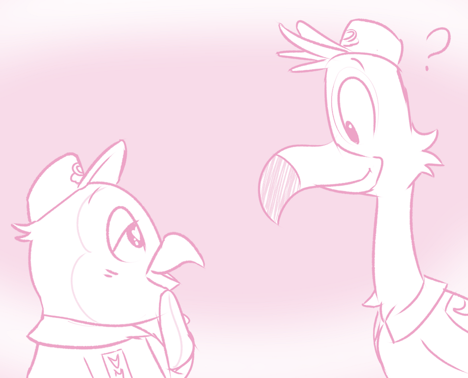 Visual Description: A sketch in pink, with Pip and Freddy from the chest up in front of a pink background. Pip is looking up at Freddy with droopy eyelids, blush, and a little heart-shaped shiny in his eyes, very dreamy or sleepy-looking compared to his normal alert self! Freddy is just smiling down at him, with slightly-wide eyes, and a clueless question mark above his head. He wonders why Pip is staring up at him like that!