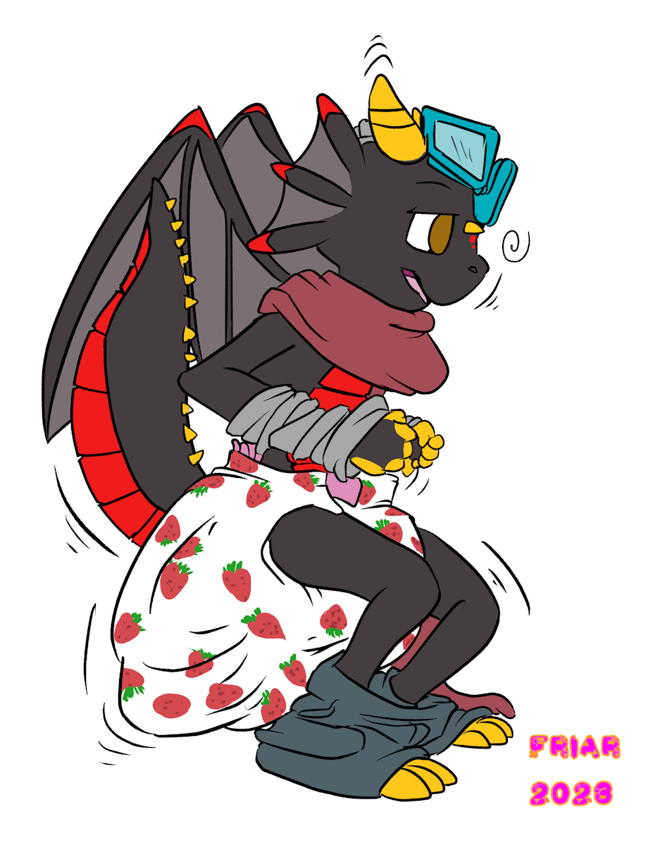 Illustration commission of a dragon regressing in his scarf and pants, pushing his age out into his very saggy and now messy strawberry print diaper. His pupils suggest he is being hypnotised as well, with a voice ominously intoning from offscreen.