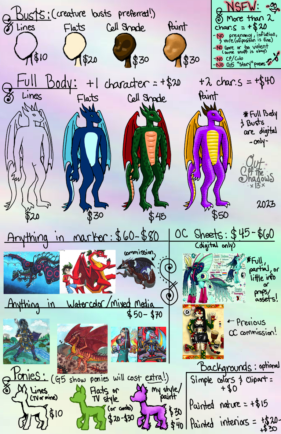 Anything with a "-" in between price means it varies depending on difficulty and if there's a whole lot going on in the pic. If the price raises it usually means it was hard to pull off and probably took me too long with some frustration (depending) Sometimes art can be challenging, just a little.