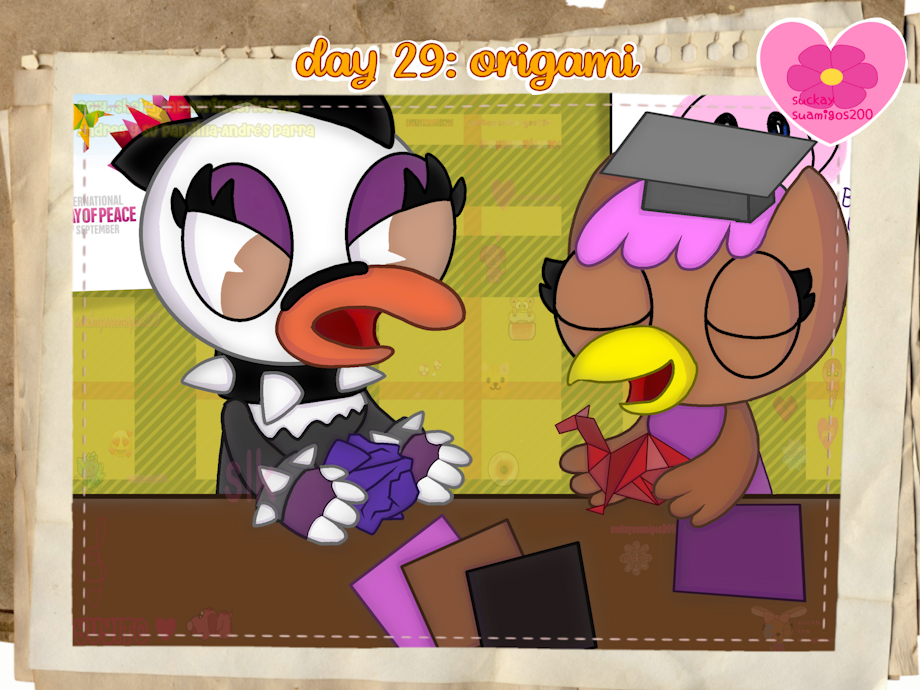 y aquí dibujé a sheila y doly quiénes estaban en la clase de manualidades aprendiendo sobre origami pero sheila le dificultaba hacer bien y doly le dice que debe hacerlo con algo de paciencia 🦉 🦢.