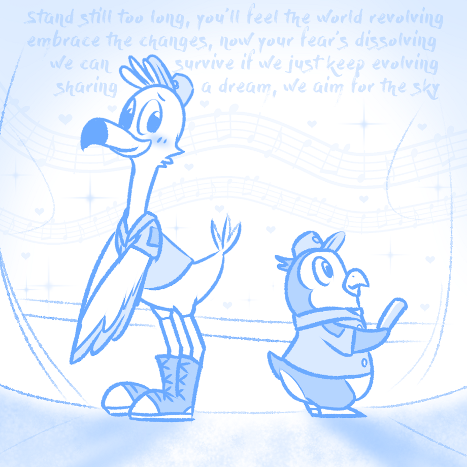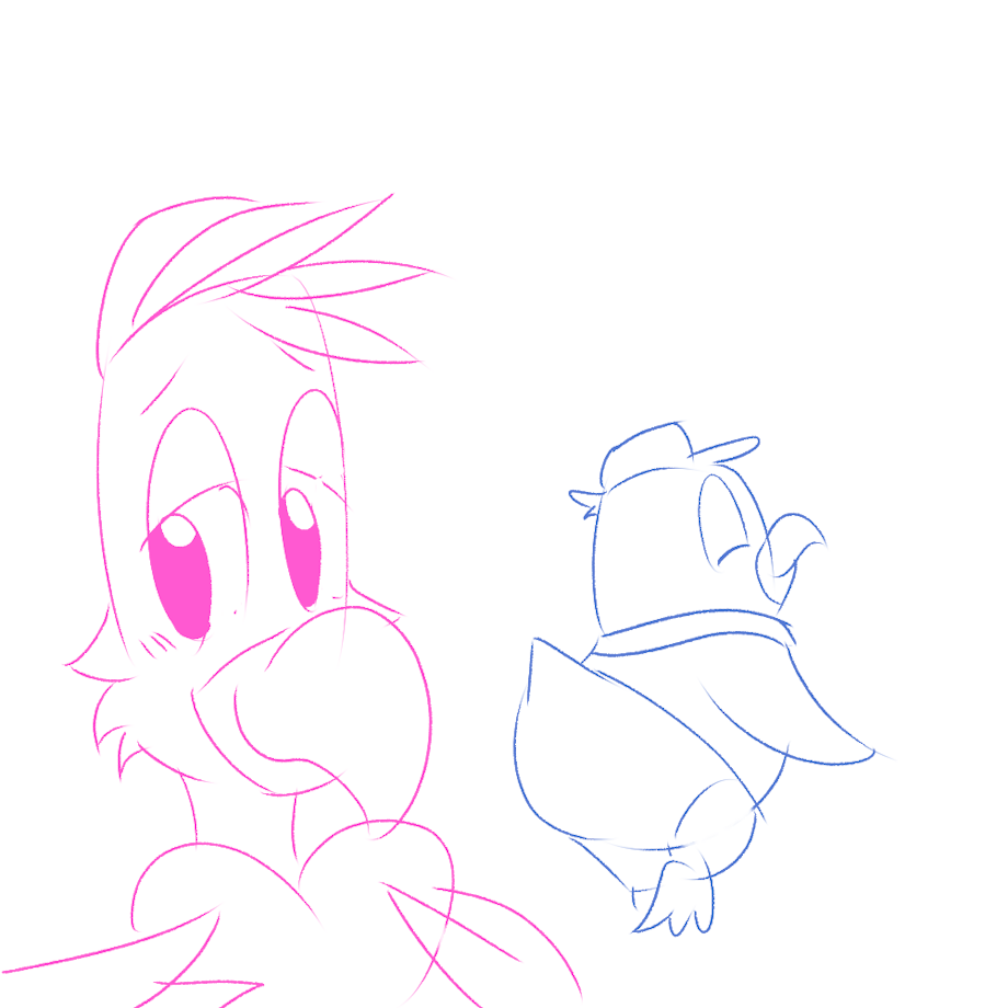 Hehe, I noticed I usually either draw Pip, the lil penguin, crushing on Freddy, the tall flamingo - or I draw them both equally into each other! But I never really draw a one-sided Freddy-likes-Pip situation. It's okay if big tall characters like us cute small characters. nvn Haha, maybe I draw from the other perspective since I'm usually the small one that likes other big cuties! But I love this pair a lot, and it could feel odd for taller folks to like us small cute ones, but hey, someone's got to! nvn So here they are, just a blue sketch-doodle, with Freddy looking back all blushy as he admires Pip. :3