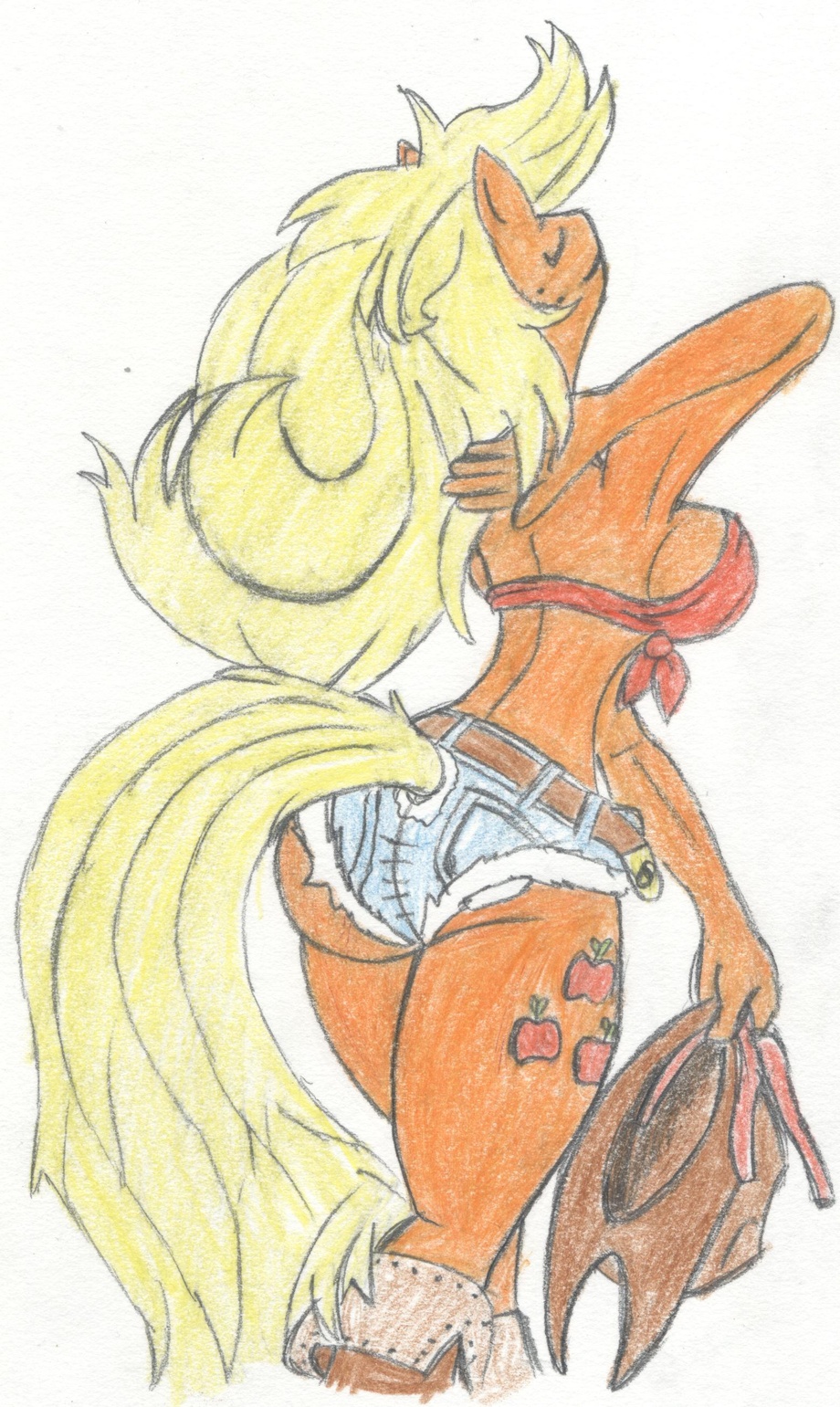 So Applejack is preparing to do some apple bucking but there's a slight problem. Seems she put on a few pounds (thanks to the apples she's already bucked) and it all went straight to her behind. As a result, the seams on her shorts are straining already and she hasn't even been able to button them up!