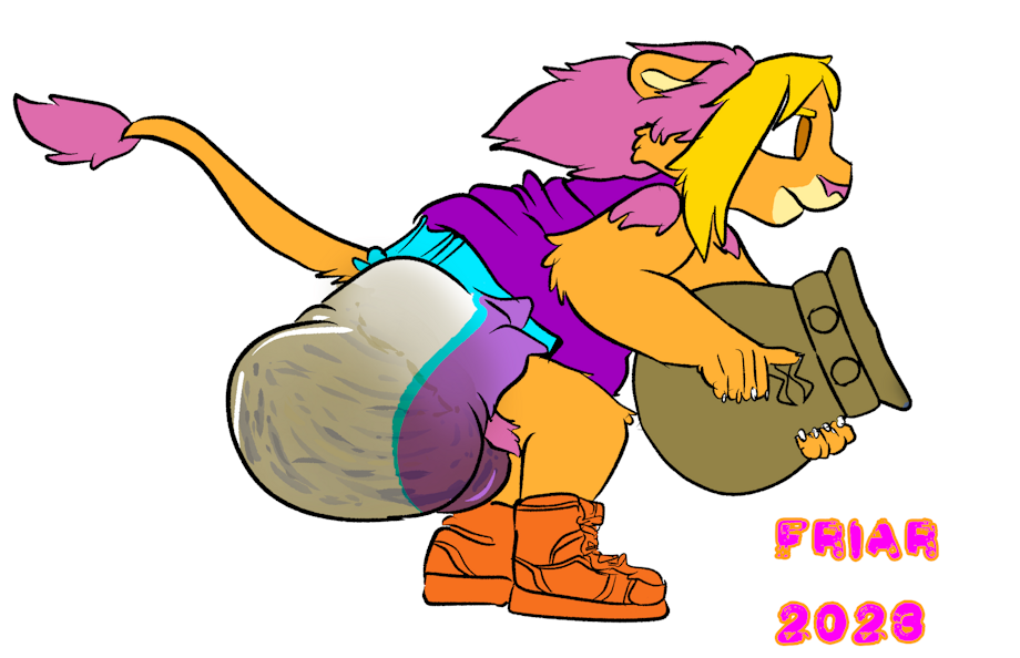 Illustration of a dreamlike scene where a messy diapered Friar is holding an Aquarius jar of water. In the background is a pair of palm trees in the left colored aqua, the golden Pleasure Temple at the end of a cliff, and a pink clouded sky with teal ocean below. In the foreground, a crab holding a pair of moons stands on a rock, with multicolored water splashing behind it. Friar looks to the right while pouring out some water from the jar.