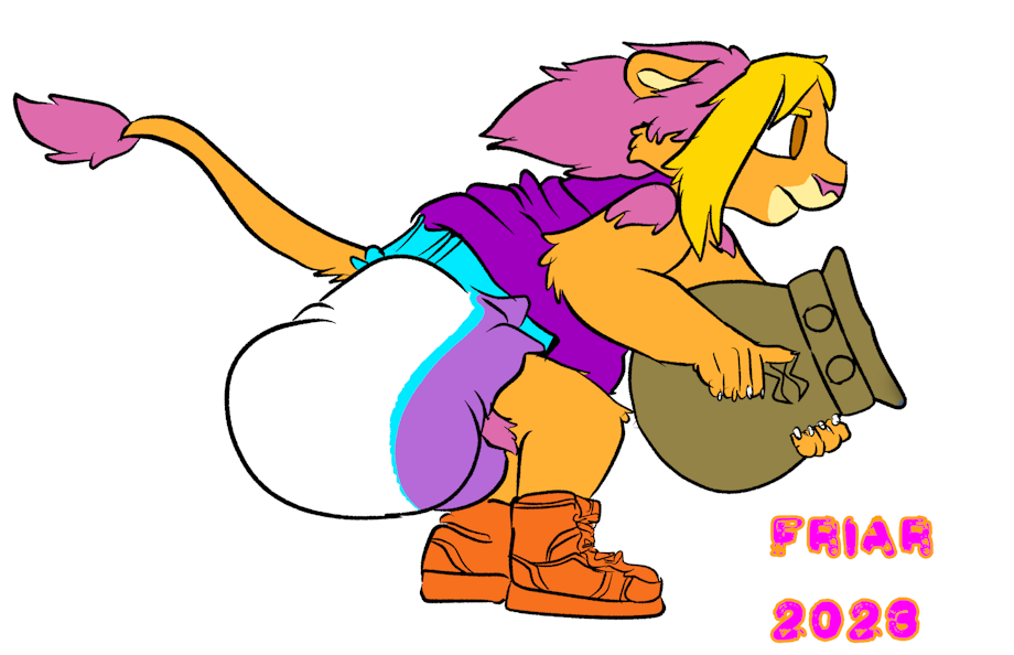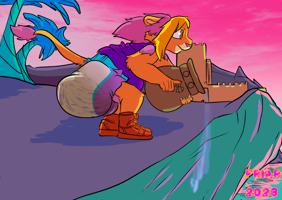 Illustration of a dreamlike scene where a messy diapered Friar is holding an Aquarius jar of water. In the background is a pair of palm trees in the left colored aqua, the golden Pleasure Temple at the end of a cliff, and a pink clouded sky with teal ocean below. In the foreground, a crab holding a pair of moons stands on a rock, with multicolored water splashing behind it. Friar looks to the right while pouring out some water from the jar.