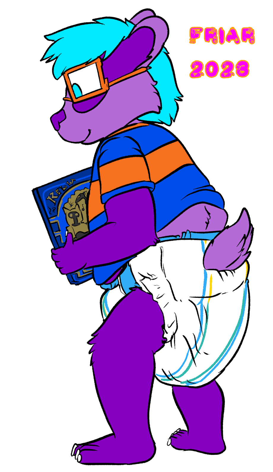 Illustration of Everett listening to a green translucent record on the record player. The record player is sitting atop a Lion Guard potty, currently repurposed as a makeshift table. Everett is standing on the multicolored foam mats holding the album cover in his paws in a very messy diaper.