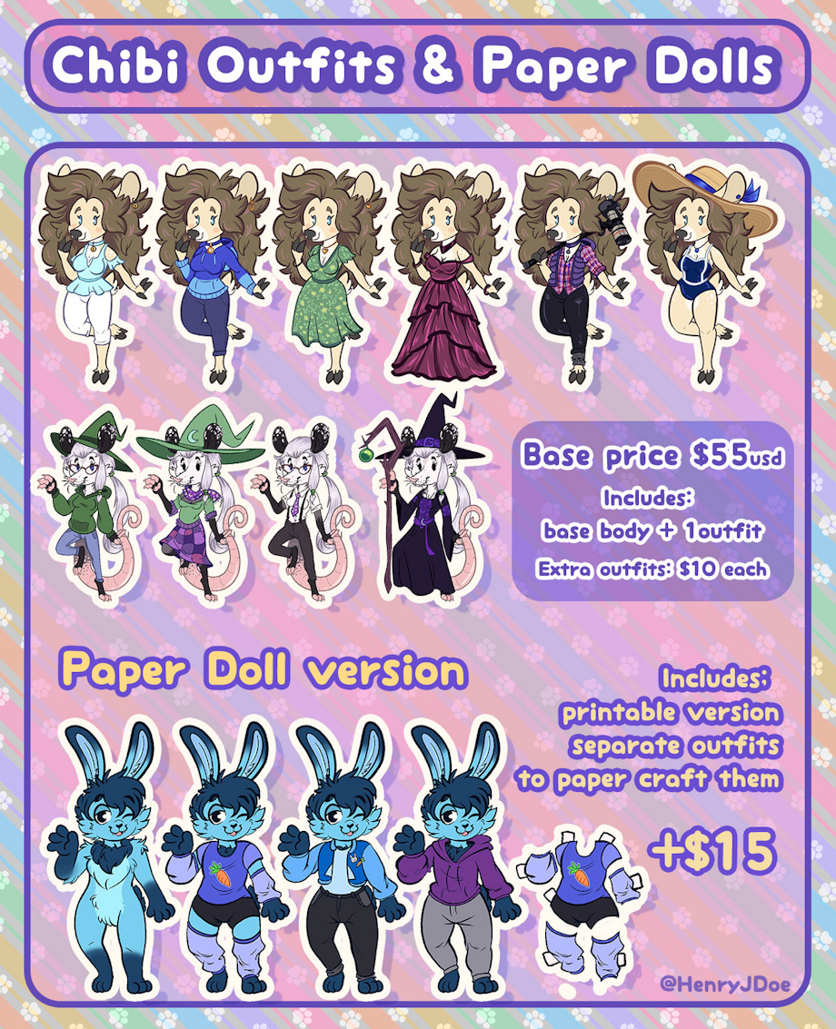 👑Chibi Outfits ✨Base price: $55usd ✨Includes: base body (no clothes) + 1 outfit ✨Extra outfits: $10usd each 🟡You can pick the outfits or leave them to me
