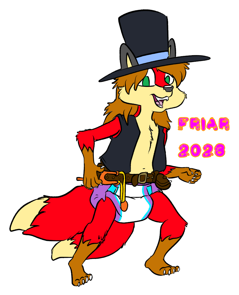Illustration of OzzyFox smiling and dressed in a top hat, vest, belt with pouch, and diaper. Ozzy has his paws by his side, ready to draw his slingshot.
