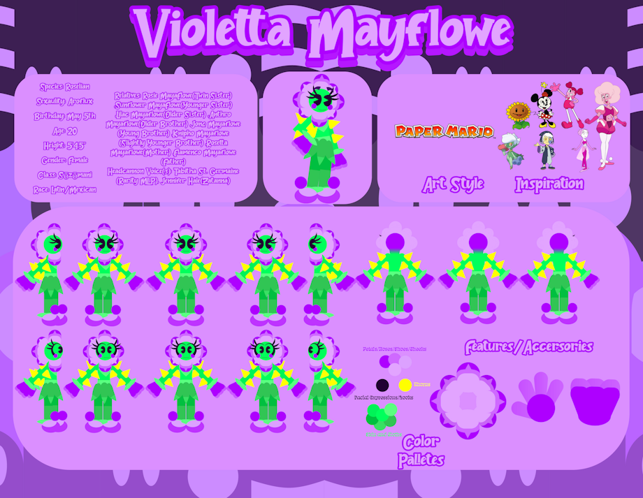 Rosie MayeFlowe (Twin Sister), Sunflower MayeFlowe (Younger Sister), Lilac Mayeflowe (Older Sister), Anthro Mayeflowe (Older Brother), Jonq Mayeflowe (Young Brother), Knipho Mayeflowe (Slightly Younger Brother), Rosetta Mayeflowe (Mother), Flamenco Mayeflowe (Father)
