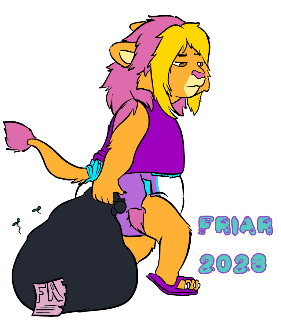 Illustration of Friar bringing out some trash to the garbage truck. He looks bummed out, and the trashbag he is dragging has a piece of paper with "FA," stuck to it.