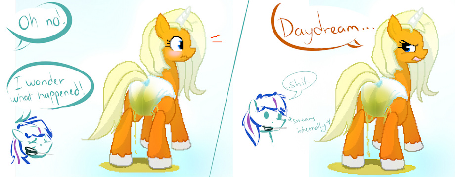 She seems to have had a bit of an accident...despite wearing her diaper. >.<'