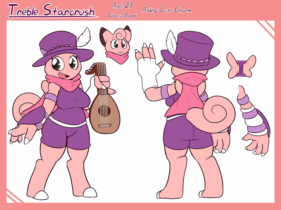 Famed bard, seductive heartthrob, and beloved storyteller, Treble Starcrush is an anthropomorphic Clefairy who roams the world looking stories to tell and lovers to seduce. They are a professional musician and lute player who uses their musical prowess to entrance those who aren't already smitten by their charming personality. Though be warned, they are also an experienced adventurer and fighter, and will protect their friends by any means that they can.
