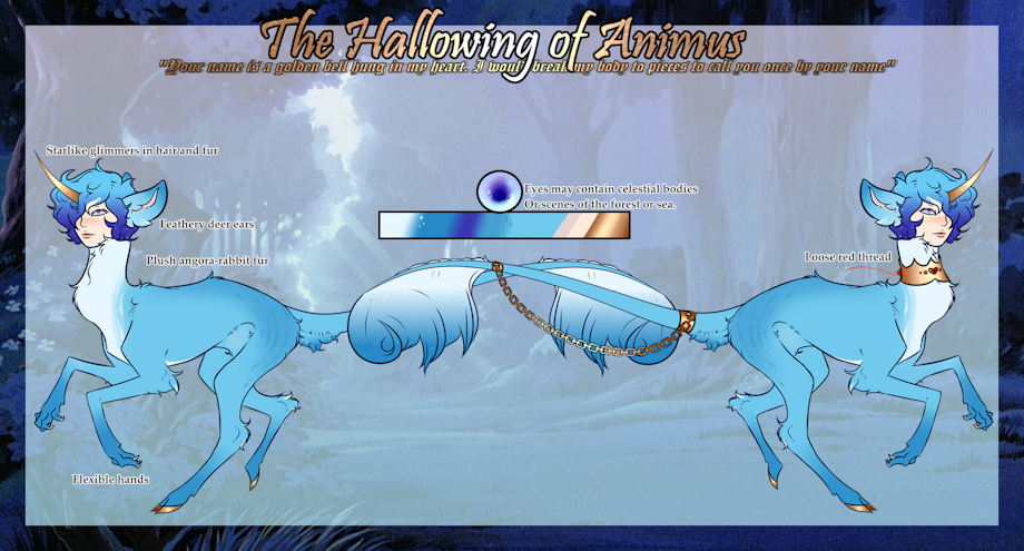 Hallow is not so large as some of his kin, he is built lightly, with long slender legs and a body somewhere between that of a deer, a horse, and a canine such as a bedlington, his neck is slim, holding his head high, face pretty and boyish with large questioning eyes; they are a pale mix of baby blues and lavenders, infinite in depth, the pupil seems to cloud and blend with the surrounding colour, and the eye itself shows not the reflection of the looker, but of celestial bodies, distant seas, or his home forest.