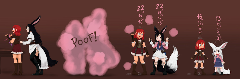 7Tsuki & Bittersweet got a lil' Age Regression sequence! Tsuki sneaked up behind Aurora Dawn while she was working with a couple potions, causing a chemical explosion that regresses them both, Aurora to 5 years old and Tsuki to 3, their outfits adjusting accordingly, Tsuki seems quite happy with this tho.