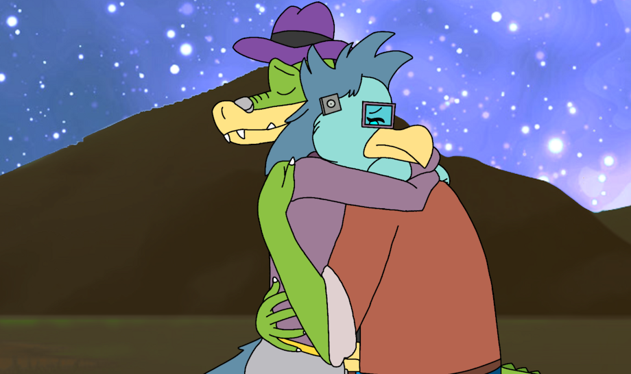 Inspired by that ending and to celebrate this occasion, I drew this fanart about how Brok misses Graff and hoped how the altered timeline be like if he did prevent Lia's death. Oh, this is also inspired by the song "Somewhere Out There" from one of the Don Bluth films I grew up with "An American Tail".