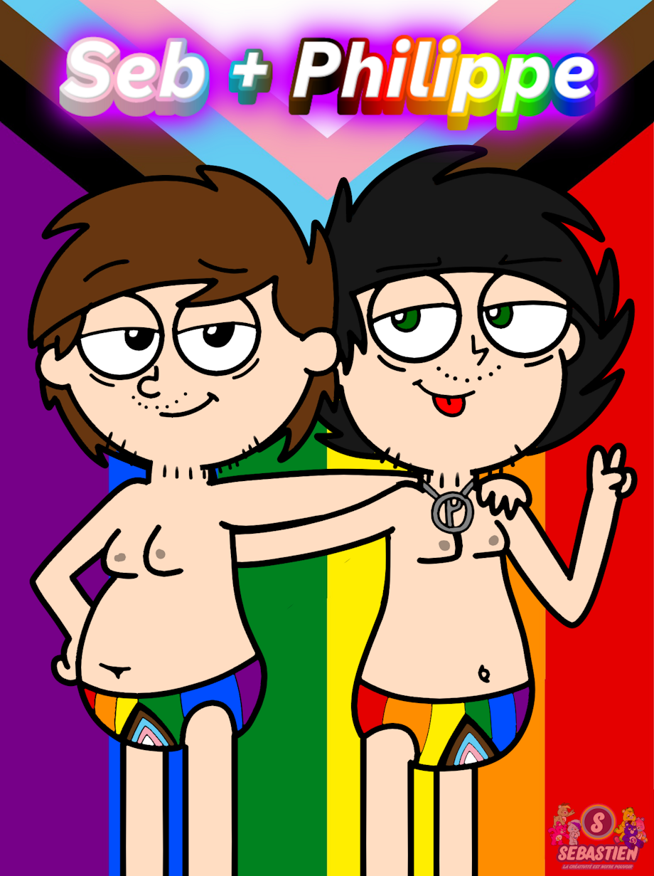 Here's a gay drawing of Seb and his gay lover Philippe Gayer showing their rainbow panties and striking a hot pose in front of the progress rainbow flag.