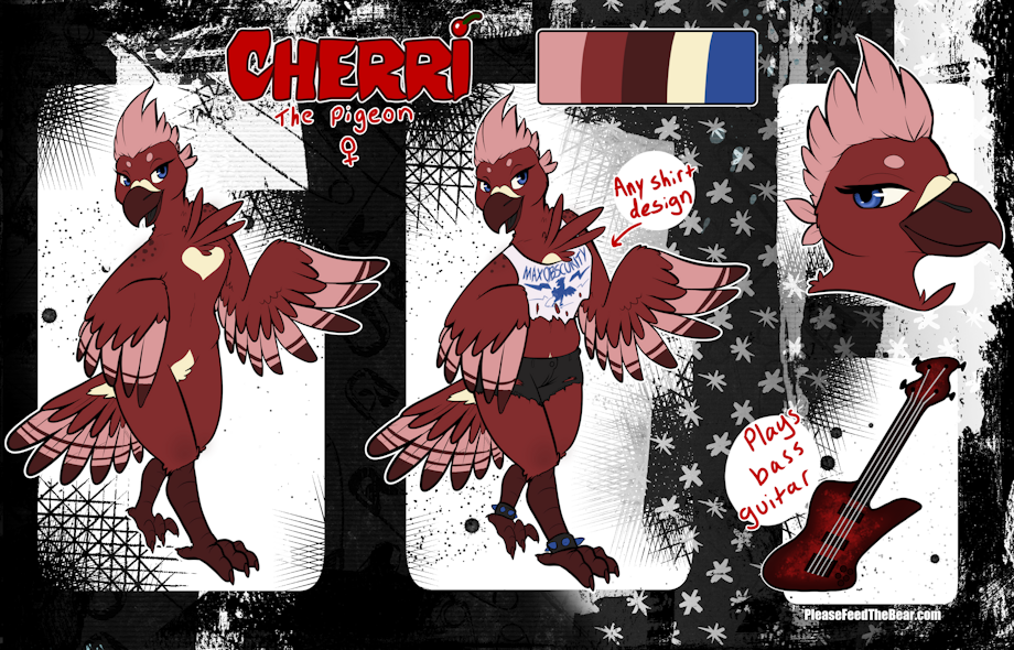 Here we have the bassist of the bird band. She's rather chirpy and likes to be pushy. Her hobbies include skateboarding, jamming out and watching horror movies. Unlike the rest of the birds in the band, she's a little more selective too