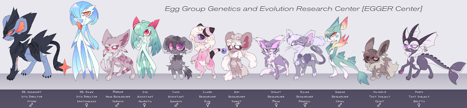A small lineup of characters from my Eevee's story! They exist in a PMD-style world. The EGGER Center is a research center which focuses on studying egg groups, mutations, hybrids and shinies phenomenons in a world within which they are poorly understood. From left to right:
