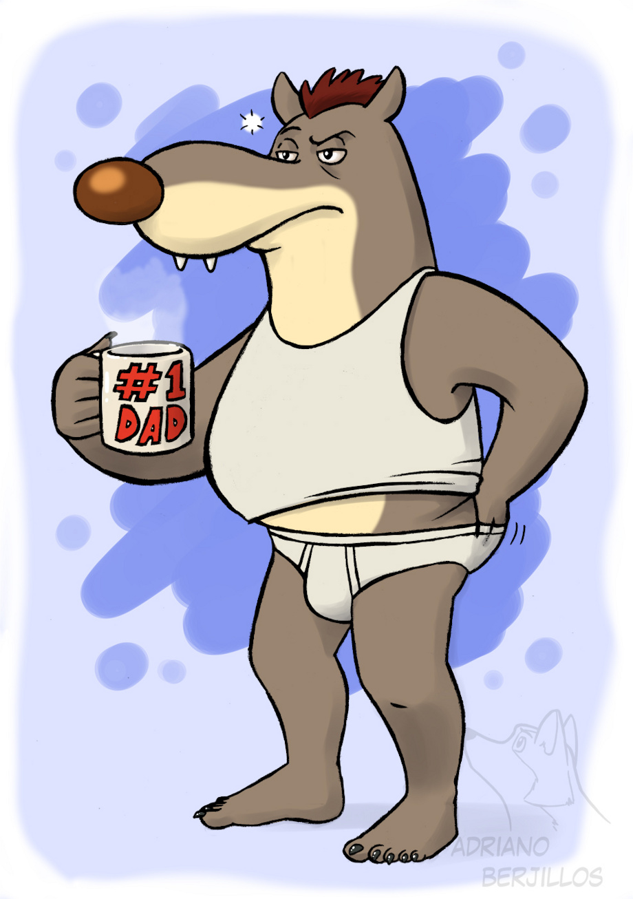 Big Wolf's dad is a construction worker who only appears in one episode. And he looks the typical DILF who is always in white briefs and tank top when he's at home, so, here he is, taking the first coffee of the morning.