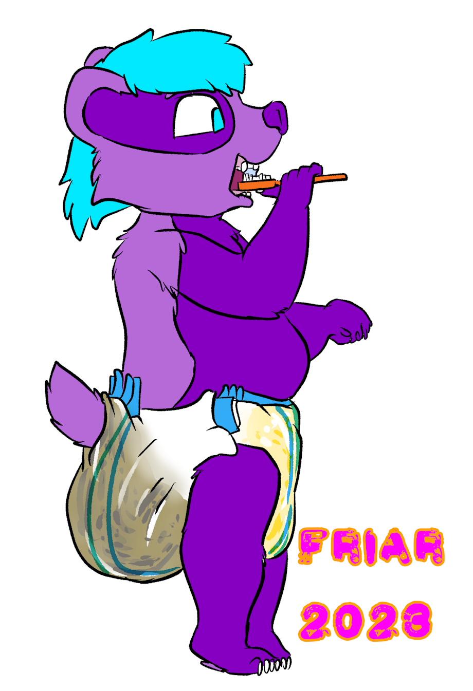 Illustration of a side view of Everett in a wet and messy diaper standing on a step in front of the sink brushing his teeth. An unused potty seat contains a plunger and toilet brush under the sink, and a bottle of cleaner can be seen next to the potty. A towel rack, tiled wall, and the darkened interior of the trailer home are seen beyond the partially closed doorway.