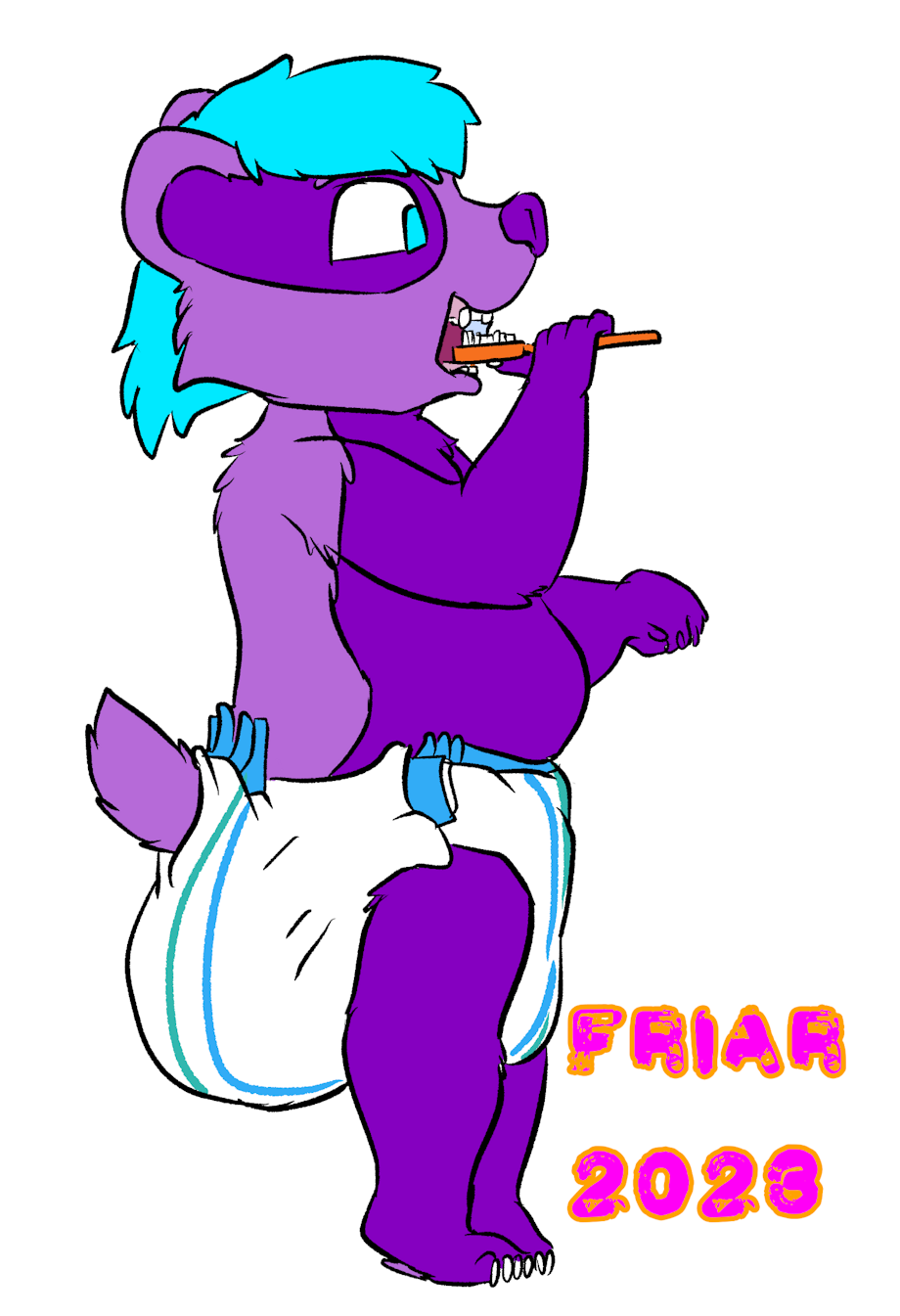 Illustration of a side view of Everett in a wet and messy diaper standing on a step in front of the sink brushing his teeth. An unused potty seat contains a plunger and toilet brush under the sink, and a bottle of cleaner can be seen next to the potty. A towel rack, tiled wall, and the darkened interior of the trailer home are seen beyond the partially closed doorway.