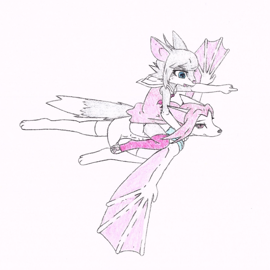 Drawn for peppybatt. Peppy's fur is supposed to be an off-white gray-ish color, but it didn't show in the scanner, unfortunately. Mary and Peppy were running late for an event somewhere so Peppy decided to give her friend a lift. Peppy the Bat belongs to peppybatt Mary belongs to me. Art done by me.