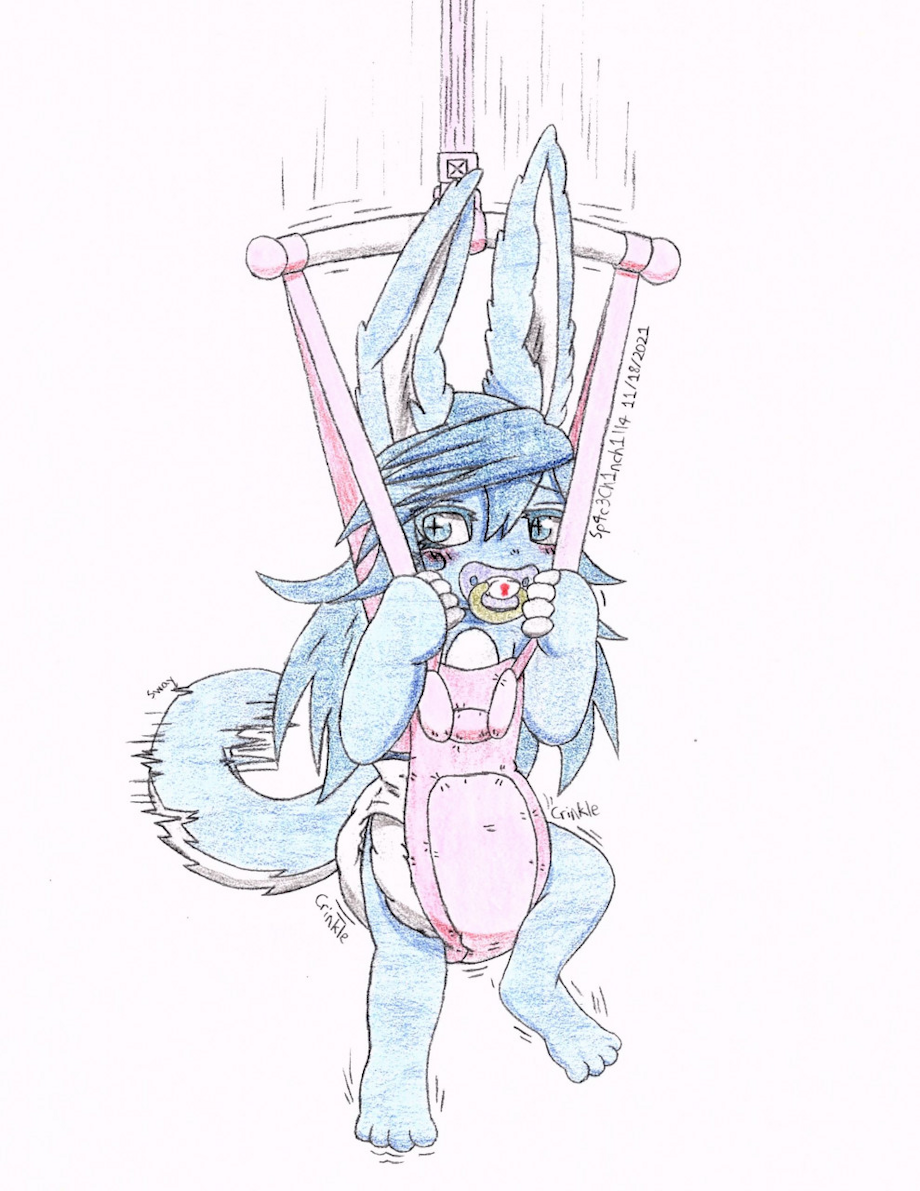 Fälla, recently transformed from a young adult human to a small Narehate, has been moping around and wetting himself. His new caretaker decided to show him being little again can be fun by ordering a bouncer and putting him in it. She also gave him a locking pacifier for good measure. If he could speak right now, he'd be saying he doesn't like it, but that wagging tail doesn't lie, he's enjoying himself as much as he didn't want to admit it.