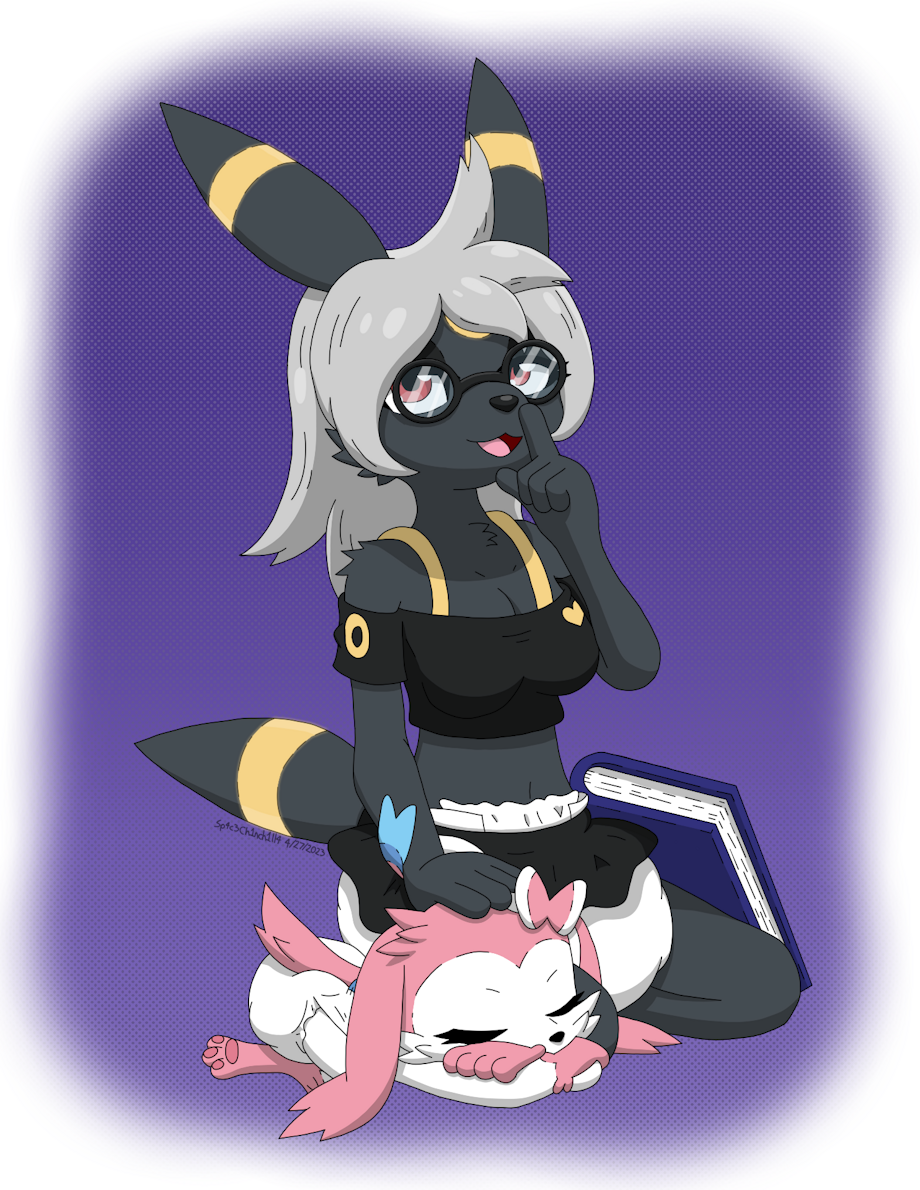 Sp4c3 recently had his sylveon kigurumi enchanted by Mogwin to turn him into one and shrink him down. Mogwin left him under the care of Lucy the Umbreon, a fellow eeveelution, to be cared for. After a fun day of activities, Lucy decides it's time for a bed time story, which lulls the new sylvy to sleep with a ribbon still coiled around her wrist. She gently lifts him to a rocking chair to sit with him for a little while just to make sure he feels safe and has nice dreams.