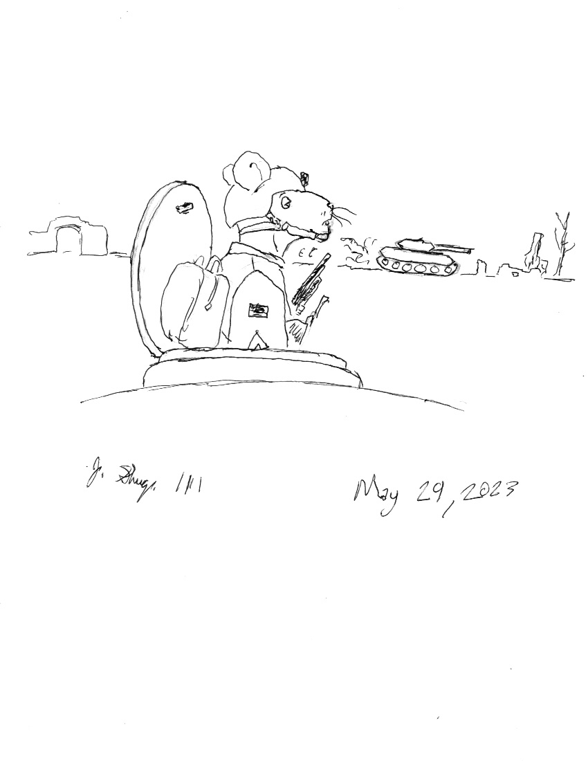 Just a quick black and white sketch I made with a ballpoint pen to mark the American Memorial Day. Just some poor mouse soldier out patroling some war torn place. Seems like a cover to the old furry comic Furrlough, doesn't it? Poor little guy.