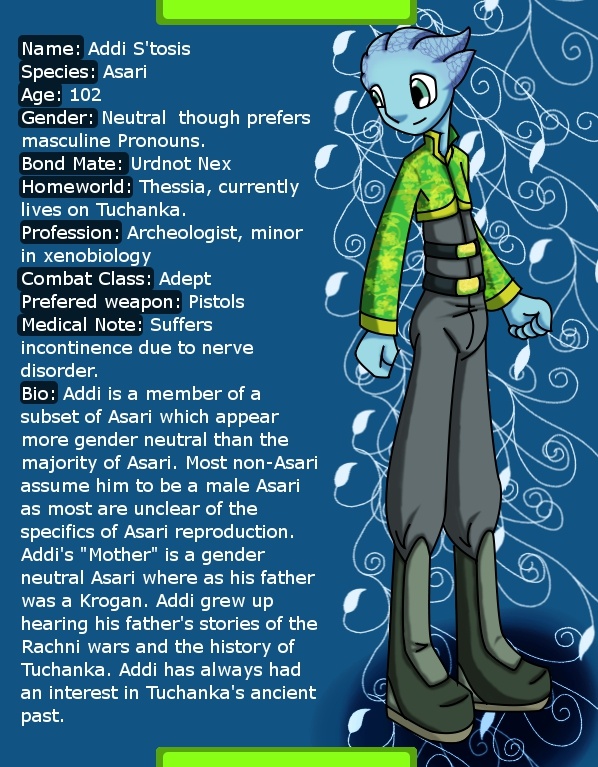 Phew. And finally got this guy done. Well I said with the last pic would come more info on my fur species in Mass Effect. So here we'll have a Codex entry on the species and then info on the character.