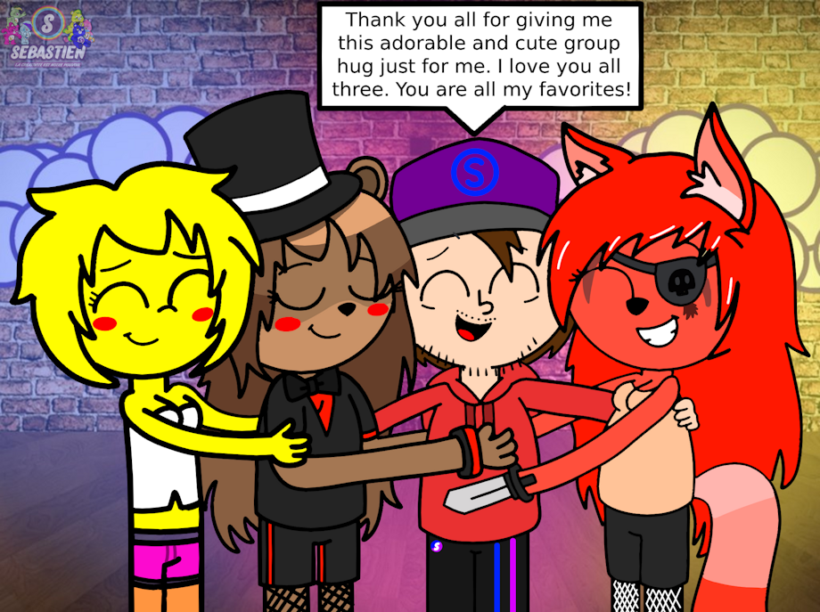 Here's the only thing why Chica-Chan, Freddy-Chan and Foxy-Chan are doing a group hug just for Mr.S (Seb): they're their favorite and they're extremely adorable the way they're dressed.