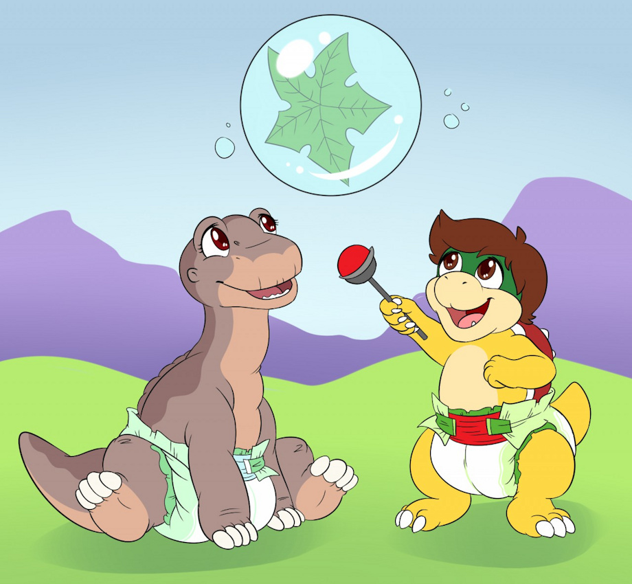 Heya buds. In this one, I appeared as a baby Koopaling as I toddled to arrive in the Great Valley and meet up with a friend named Littlefoot, which he sees me as a "sharped-shell sharptooth" at first, but he knew that I don't look very dangerous and he asked me if I could be his friend, which I accepted his friendship and before I'm ready to play with him along with introducing me to his friends, I showed him my magic wand of which he was very curious about it, wondering what does it do, so with a cast of the magic spell from my magic wand, I have regressed Littlefoot to a baby which he was surprised at first, but he seems happy to get another chance to enjoy his new youth as a baby again. Of course when a Tree Star was floating by in the wind, I casted a bubble spell with my wand as the bubble absorbed the Tree Star while it floats around in the sky as both me and Littlefoot watches in awe. I have a feeling that both me and Littlefoot are going to enjoy our adventures together along with a playdate. Anyways, I hope you buds enjoyed it. ^^