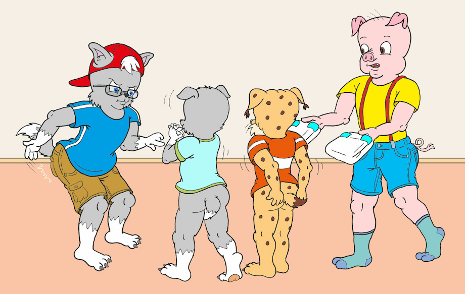 After the butt bustings, the Smith parents let their wayward child up and let them cry it out. They rocked and soothed each of them as the boys started to calm to just a sniffle while they rubbed their very sore behinds. When Kyle and Gunter calmed down, Mike and Cheryl stood them on the ground and led them to the corner of the room with the diaper changing supplies. They adults each grabbed a diaper much to the boys protests.