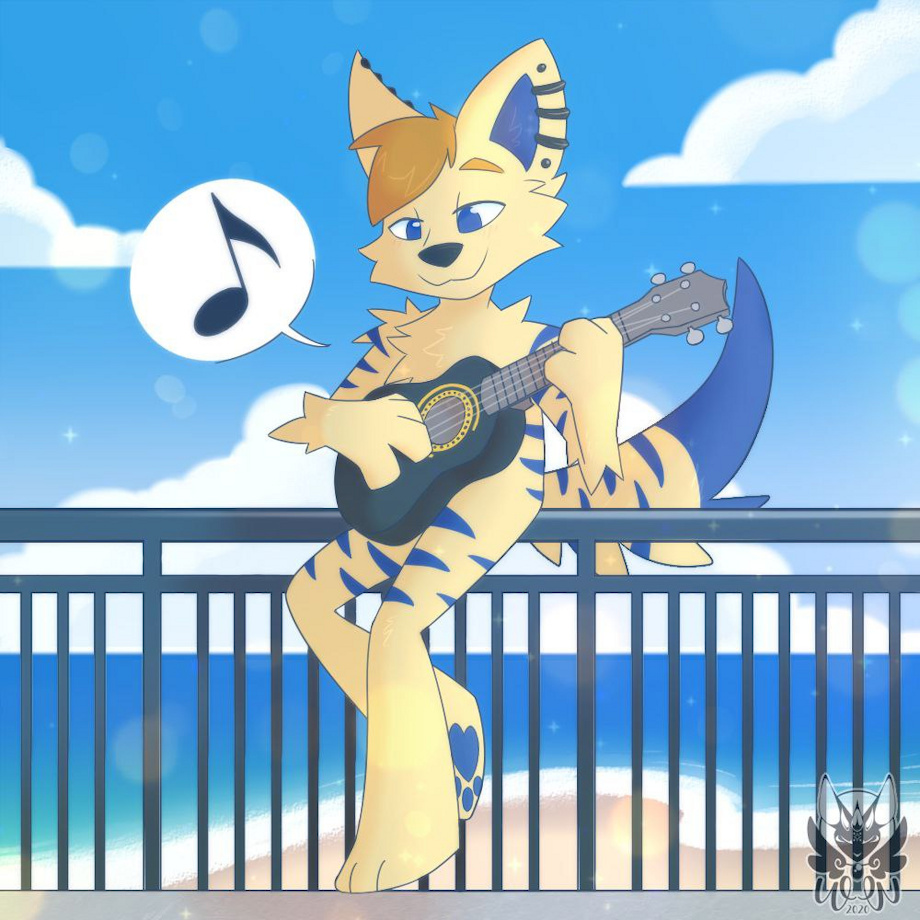 I can't remember the artist as it was a gift...anyway it is me (tekuno) on a beach pier playing the guitar (someone called it a nude beach XD)