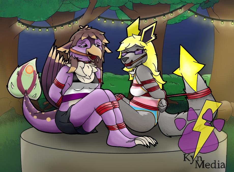 With many of her friends coming out, Kyn wanted to celebrate Pride month with a Pride Month's Eve garden party nearby. Many of her friends attended the celebration, most bringing food or games, while some would bring a little something extra to the party. Said extra would have both Kyn and Alyna sat on a rather wide pedestal fit for the pair, and with Anikka's help, the two were bound up tightly in bright red rope, happily gagged and placed on display for the guests to admire. With nothing but pride themed swimsuits to cover themselves the pair once again made into centerpieces to another fun party, something that they had planned out ahead of time anyway, and something which didn't seem too out of place given the level of bondage the other guests were in. Even Anikka, sporting a lesbian string bikini and fishnets, was tied up at one point despite being the main domme of the party, sporting a large ring gag both to keep her gagged and because Shyla had caught her eating one too many slices of cake, and she needed to slow down on her sweets.