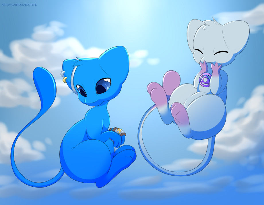 Since she was now old enough to wander outside their lair and explore Cyra's valley, the two mothers decided to have a picnic with her. Of course, the rambunctious Mew also thought it would be fun to play wrestle with Cyra and her scarf.