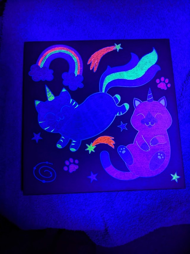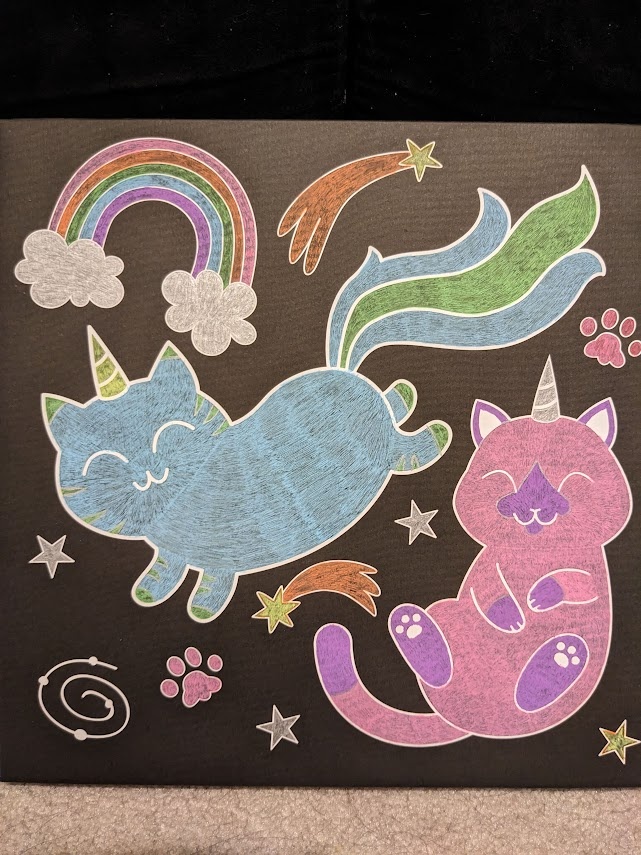 Was unsupervised at Michaels and got this cute "color-your-own" picture. It came with pastels, but I didn't think they were vibrant enough against the black for it. So I used a bunch of my gel pens for this.