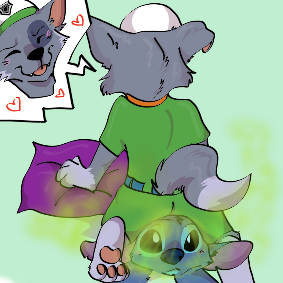 Rocky just wanted to sit on his plush but he felt some gas , he didn't move to fart he just ripped a big fart on the head of the poor alien plush who was like "wut ?" He probably wonder what he did wrong poor Stitch is being tortured so much !!!! Rocky just enjoy releasing his stink , such a stinky cub he is !!! Phew !