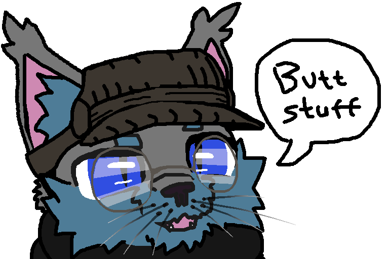 Badly drawn cat fursona with speech bubble saying "Butt stuff"