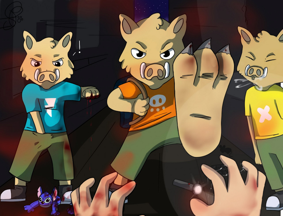 Ceasar took the plush of my master ripped it under his feets and at the same time punhing me while scratching his balls to maybe slap me after , Napoleon stomp me with his feets and Attila spit on me and on the plush , i start bleeding badly , i didn't knew that those cute boars were that strong