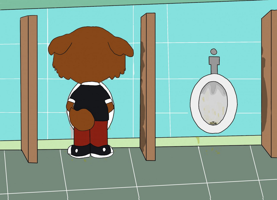 Because of the morning rush , Mini Loup forgot to go to the toilets at his home
