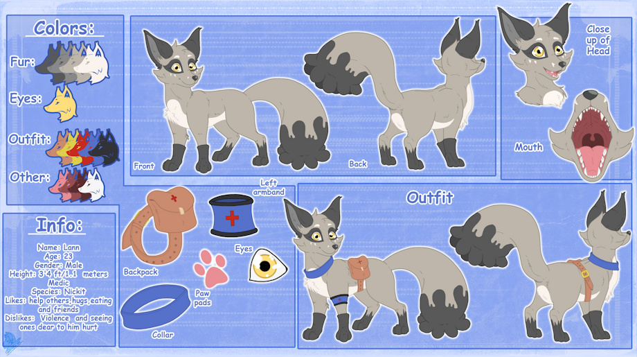 Apearence Lann is a shiny Nickit with average size wear a blue colar as medic bandana on his front leg and wear a medic bag