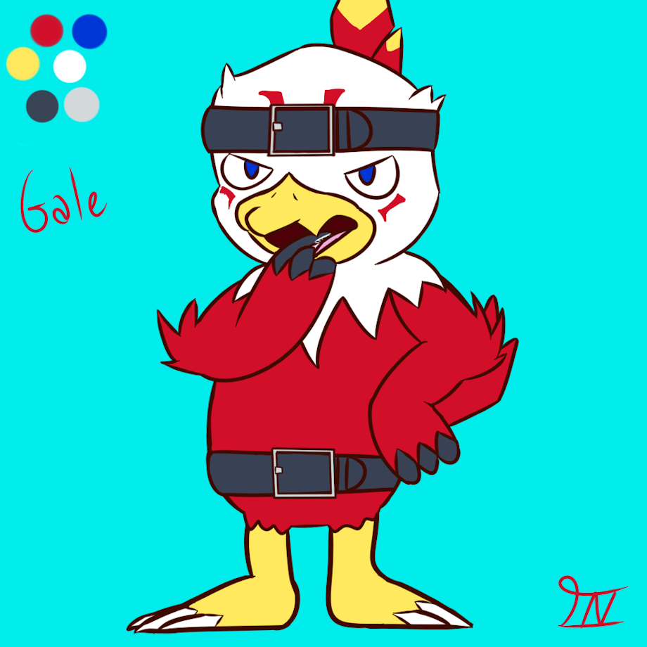 This is Gale, he's a lustful Hawkmon. He wears two belts and two feathers. He's a bit old too
