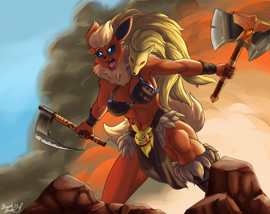 A less "kid friendly" idea of pokemon battles or perhaps simply in an alternate world where Pokemon wage battles of their own. Looks like a fierce one is about to break out as this fighter leads the charge.