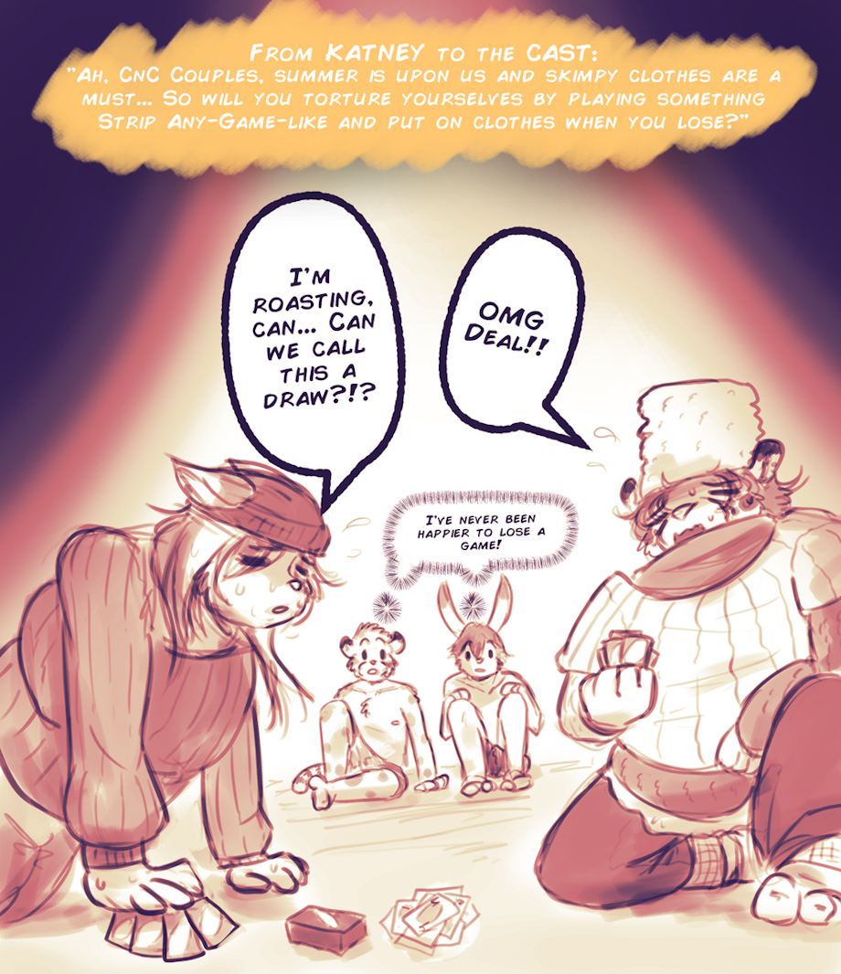 KatneySK — Ah, CnC Couples, summer is upon us and skimpy clothes are a must... so will you torture yourselves by playing something Strip Any-Game-like and put on clothes when you lose?