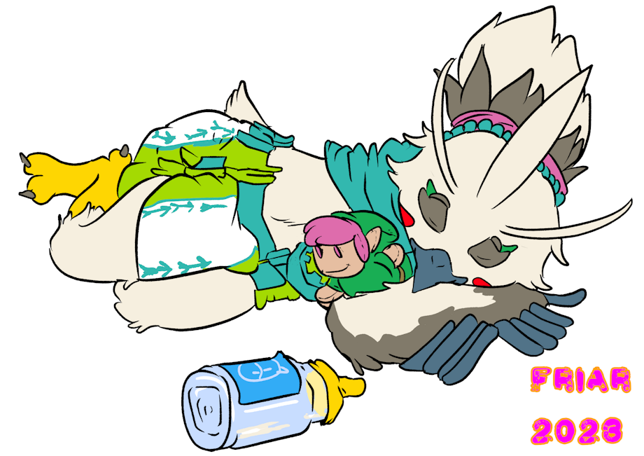Illustration of Tulin curled up in his crib, taking a nap. His arm wings are nestled under his head, which closely hold a Link plushie. A mostly empty bottle of Lon Lon Ranch milk is placed before him.