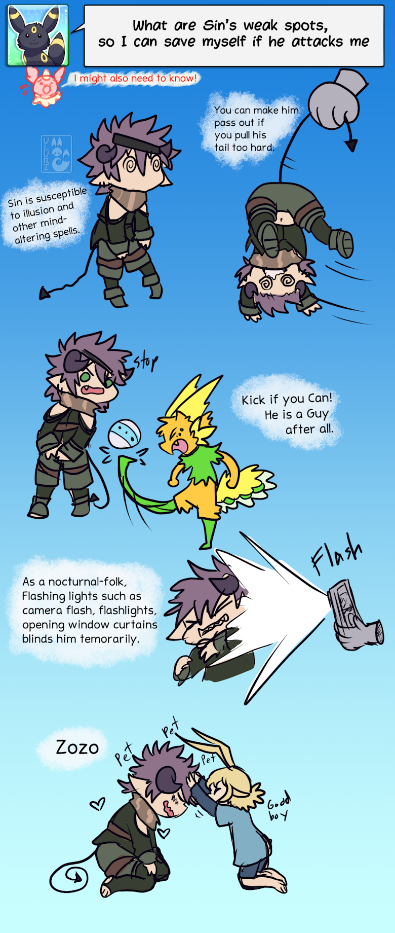 How does one protect themselves from Sin? Well, he has a plethora of weaknesses to abuse(Sin: Hey hey hey hey).My favorite is his lack of resistance to Mind affecting/altering things. But if you aren't some mage or alchemist, and need to get away quickly, perhaps try kicking or pulling on a few things. You can even use your phone's flash and run away with a souvenier. But run quick. But, if you want to make sure he's a good boy at all times, just keep Zozo near (and safe. Kidnapping and threats give the opposite effect).