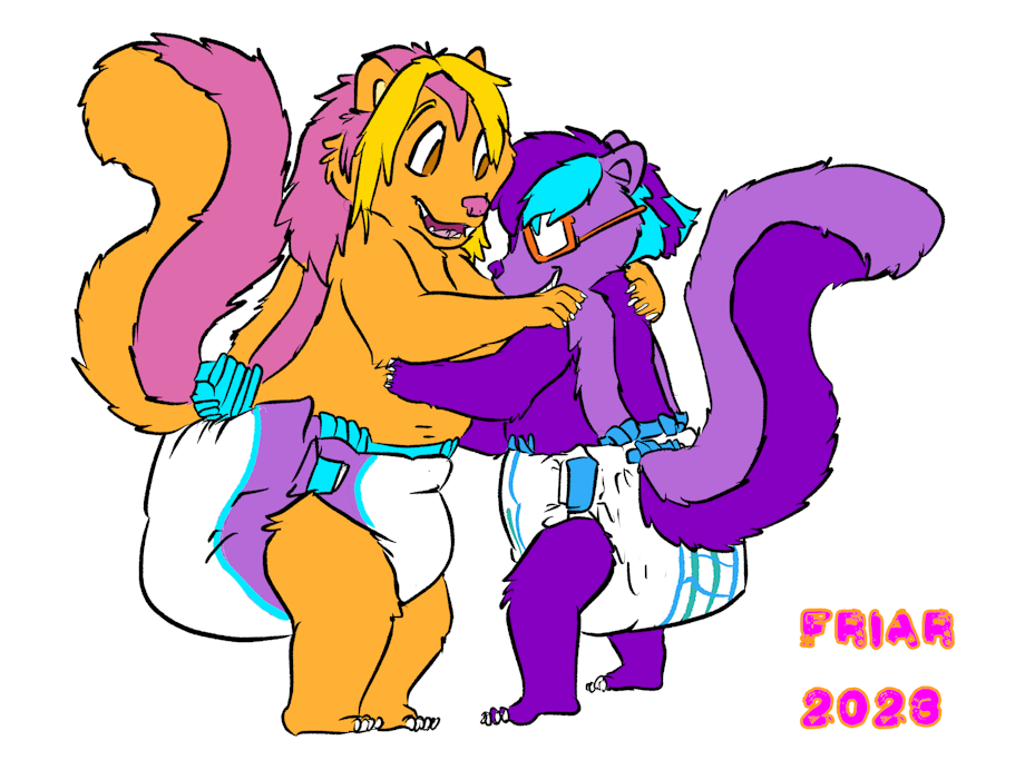 Illustration of Friar and Everett as wet and messy diapered skunks hugging in front of a burrowed out home in the forest. Fireflies light up the background, which also features a hollowed out log, tree stump with tea set, and a large old tree in front of a pond with reflections from the fireflies and tree.